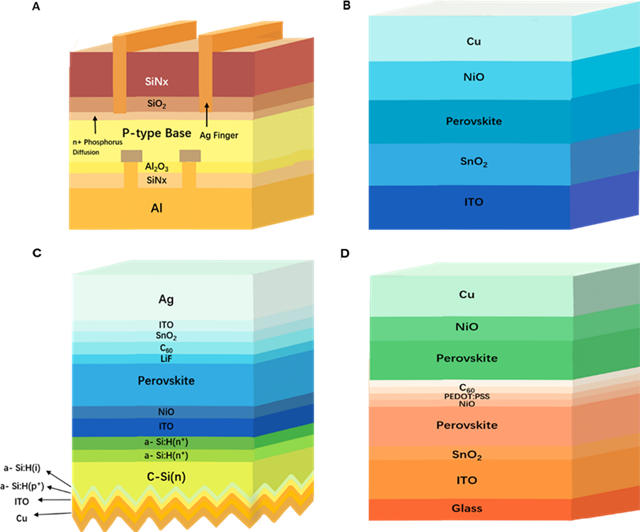 图1(A)为PERC多晶硅电池材料组成;(B)为单结钙钛矿电池材料组成;(C)为钙钛矿/晶硅叠层电池材料组成;(D)为钙钛矿/钙钛矿叠层电池材料组成。